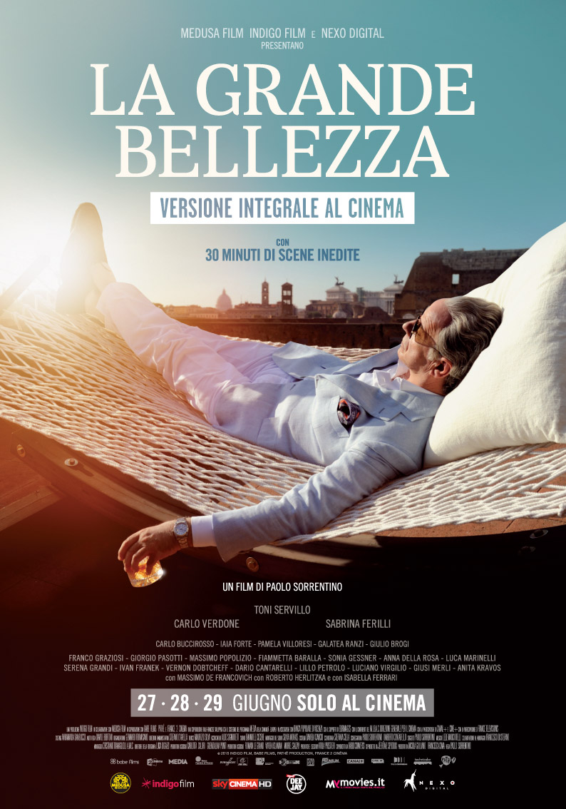 A distanza di 3 anni, Indigo Film, Medusa Film e Nexo Digital riportano nuovamente in sala, per soli 3 giorni – dal 27 al 29 giugno –  La grande bellezza, in una versione estesa che comprende 30 minuti di girato in più rispetto all’edizione vincitrice dell’Oscar come miglior film straniero. Che sia piaciuto o meno, lo si sia amato o detestato, o più difficilmente abbia lasciato indifferenti, La grande bellezza ha segnato un qualche spartiacque nella proposta cinematografica italiana, riportandoci anche in modo più evidente sullo scenario internazionale.