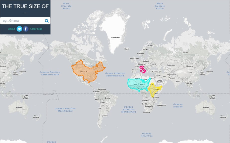 Con True Size Of non trattiamo oggi di un vero e proprio caso di Gamification, almeno non del tipo Business, quanto piuttosto di uno strumento che rende gioco lo studio della geografia e permette di cogliere gli effetti della curvatura della superficie terrestre sulla nostra percezione delle dimensioni degli Stati. D’istinto, quanti di voi direbbero che gli Stati Uniti d’America rappresentano neanche un terzo della superficie dell’Africa? O che l’Italia è più piccola della sola California?